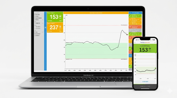 - Interactive graphs showing glucose trends over time