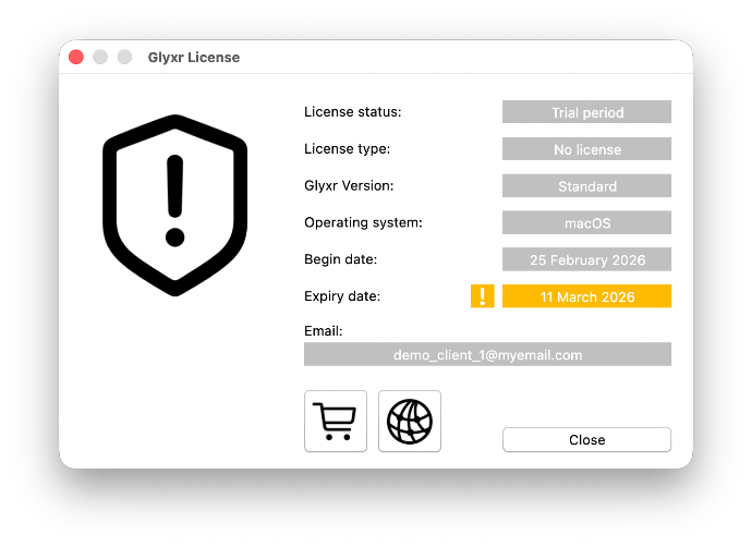 Within the Glyxr program you can check your license status. If your license will expire soon, you will get informed.